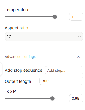 - 一般的な設定には、「1:1」(正方形)、「4:3」、「16:9」(ワイドスクリーン)などがあります。テキスト生成モデルの場合は、この設定は存在しないか、意味を持ちません。